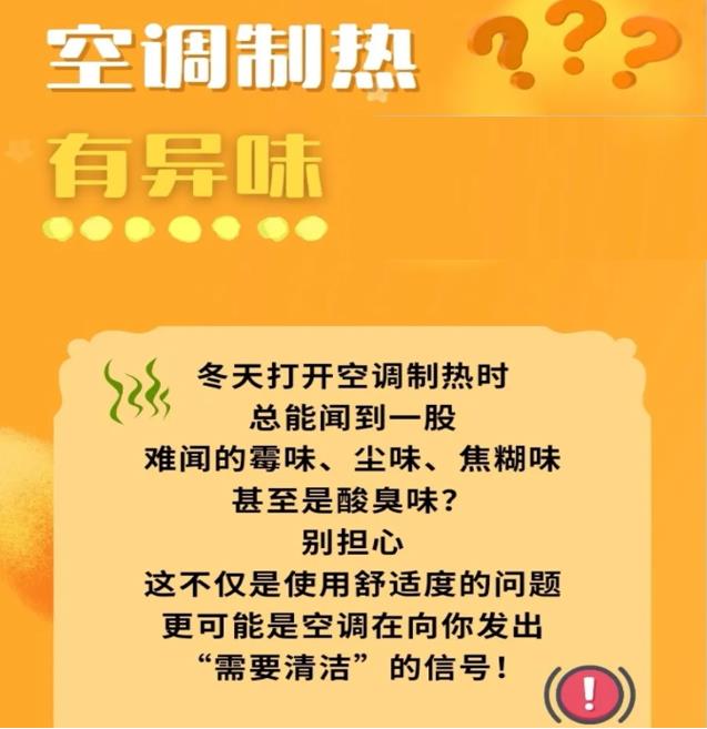 冬天打开空调制热时总能闻到一股难闻的霉味、尘味、焦糊味,甚至是酸臭味?别担心,这可能是空调在向你发出“需要清洁”的信号!